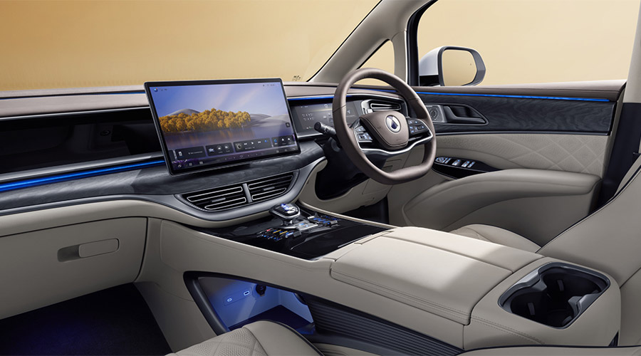 Masuk ke dalam interior, terdapat layar head unit ultra- high-definition sebesar 15,6 inci. Panel instrumen MID sebesar 10,25 inci, memberikan informasi pengemudi mulai dari navigasi, peringatan, mode berkendara, status baterai hingga informasi penting mengenai kendaraan lainnya. Sebagai poin unik di kelas MPV 7-seater.